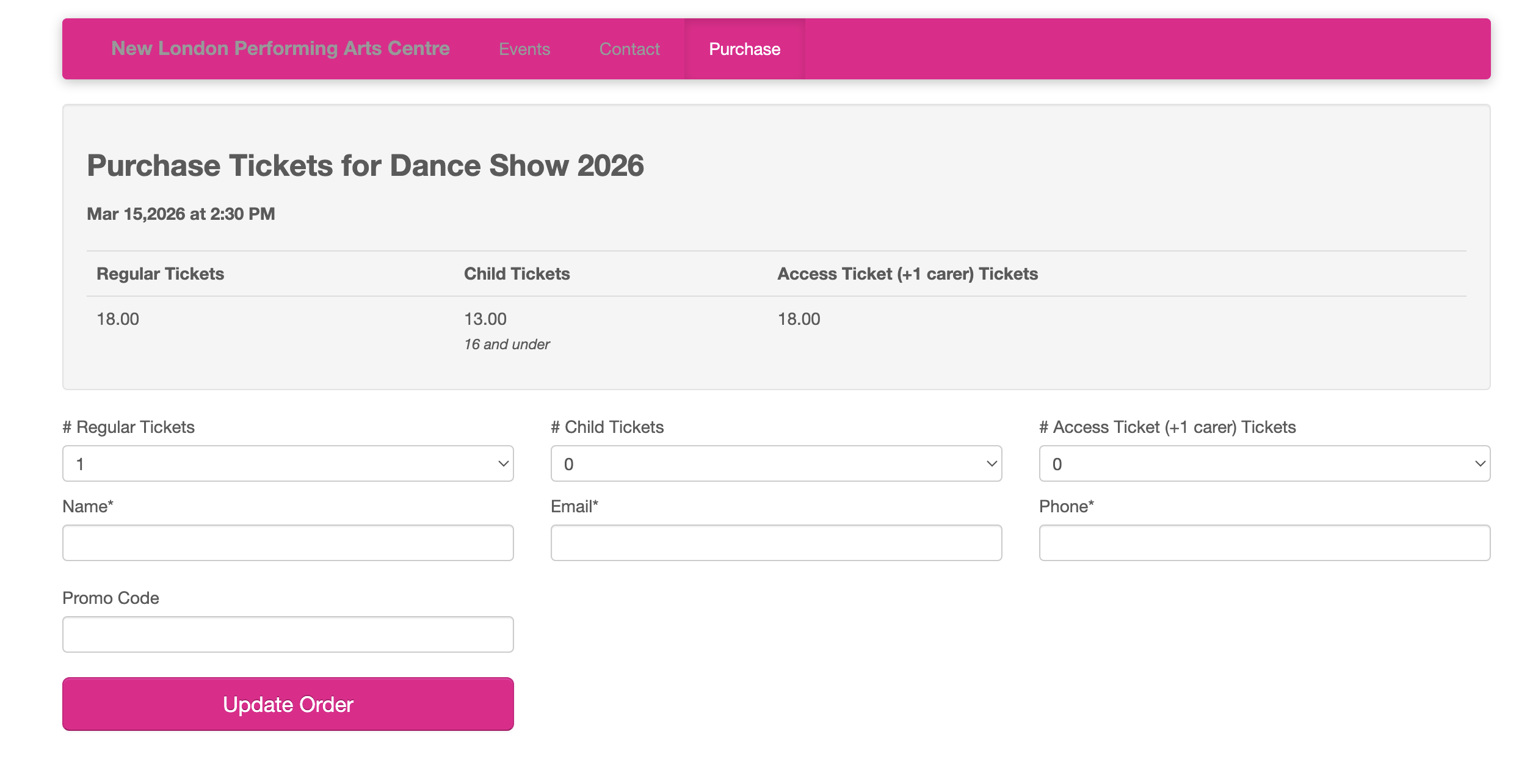 Select the number and ticket types. You can also enter your promo code here if you have one. Then click Update Order to complete your transaction